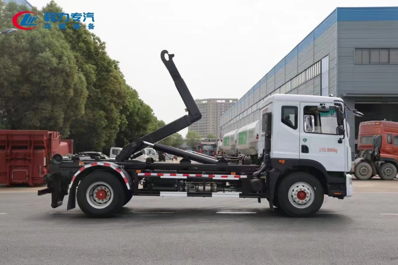 上裝配置 內置安全泄壓閥(獨有技術),配套10-16方勾臂垃圾箱或移動站,主勾臂由高強度板材制作,雙油缸控制,伸縮式主臂,加強型上裝結構,液壓支腿,橫向鎖緊,品牌多路閥,液壓油泵,標配室內外操作(帶遙控),防誤操作,帶平衡閥,液壓鎖。